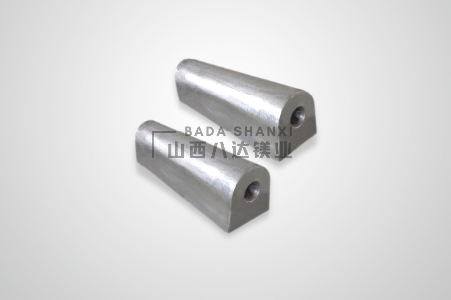八达镁合金牺牲阳极产品分浇铸(AZ63)和挤压(AZ31)两大类。公司可以根据客户的要求定做各种规格的浇铸型镁合金牺牲阳极。